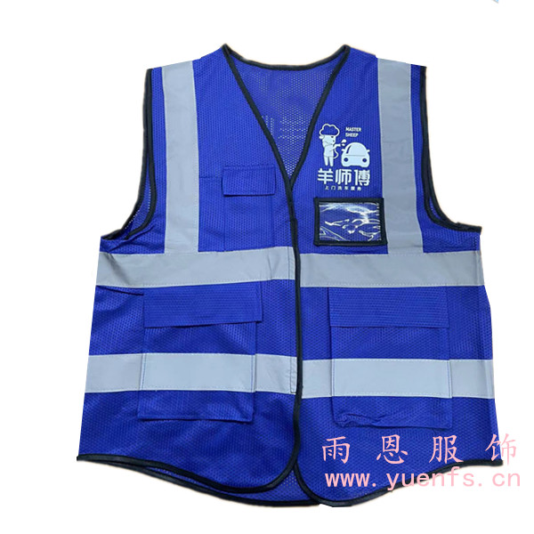 - 产品简介:看~让客户满意的反光马甲,原来是这个款 雨恩服饰的反光背心很多,但是销量好的不外乎就那几款,其中这个网布反光背心就特别受客户的欢迎,整体是彩蓝色,两横两竖的反光条贯彻证件反光衣,让安全系数大大提升, 反光马甲前幅右胸的口带能放笔,左胸口带能放名牌,下摆两个大口袋能装更多的东西呢,反光马甲定制,首选这个款!!