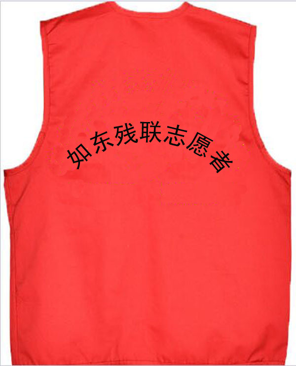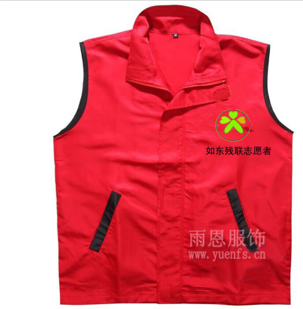 - 产品简介:如东残联人联合会所定制的志愿者马甲是一款红黑相间的款式,加厚的涤棉纱卡面料,笔挺而立体,袖子是黑色包边设计,加上口袋也是用上了黑色相撞色,让马甲穿在身上活灵活现,少一丝单调 ,前副的左胸及后副都丝印上残联LOGO和标语。雨恩服饰全国服务热线:400-808-9192 如果您对该款式感兴趣,也可直接加咨询QQ:2843559876