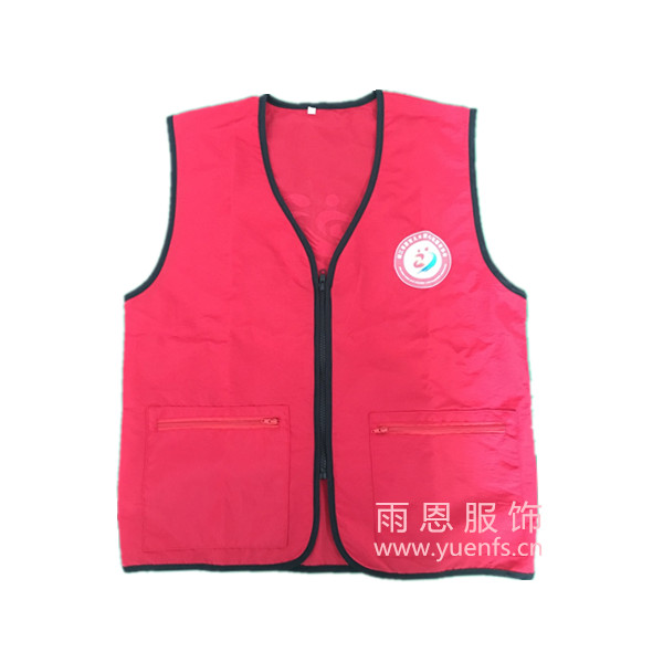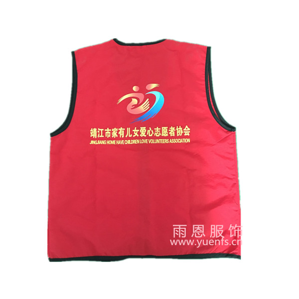 - 产品简介:靖江家有儿女志愿者马甲,红色塔丝伦的面料和黑色捆条的撞色!左胸前的彩色logo,整体就是那么搭!下摆两个拉链贴袋放私人物品都非常安全! 雨恩服饰全国定制热线400-808-9192 QQ:1487411809
