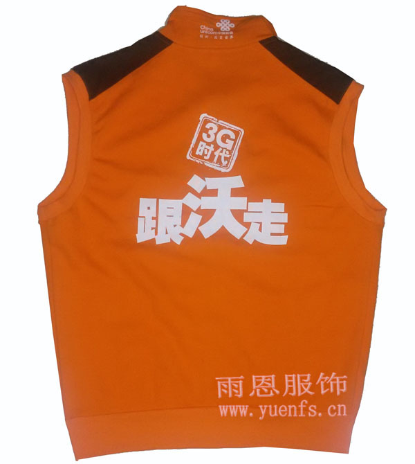 联通促销马甲采用的面料是健康布。通常指的是一面为棉,另一面为丝的具有吸湿排汗的功能的夹层双面布。面料透气性强、手感柔软光滑、肤感好,面料也是极少客户用针织布来马甲的。前副左胸和后副都丝印上品牌LOGO和促销语。