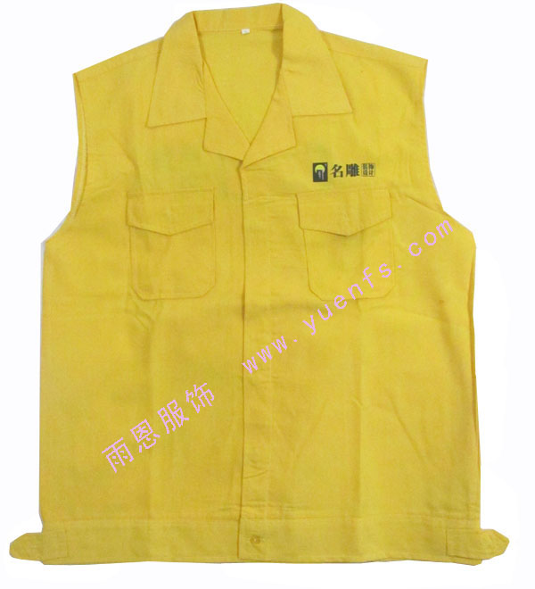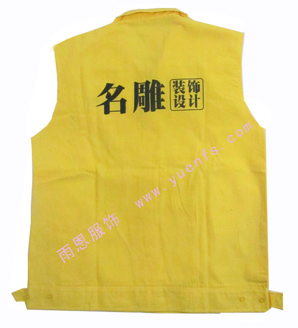 - 产品简介:名雕装饰工地马甲是由非常柔软的珠呢面料,款型是由小反领的设计,前胸的左右都加上口袋,方便装些小本本,前副的左胸及后副都丝印上LOGO及广告语。