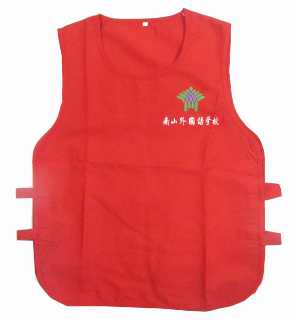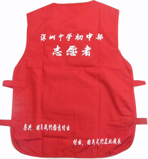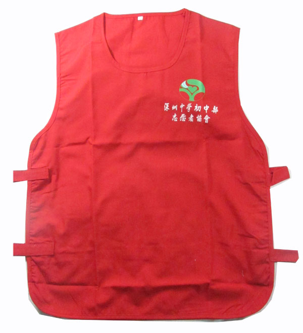 - 产品简介:南山外国语学校志愿者马甲的面料是涤棉中平布,款式的设计是圆领套头式的,款式青春活泼,两侧上的是魔术贴,方便调节大小。