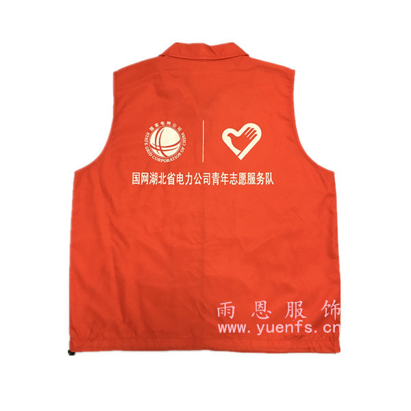 - 产品简介:湖北随州电网的服务队志愿者马夹是一款经过设计的马甲,前面白红相拼,渐变元素,加上下摆两个猪皮扣调节设计,前副及后副都丝印上电网的LOGO及标语,在线QQ咨询:2843559876 ,全国服务热线:400-808-9192