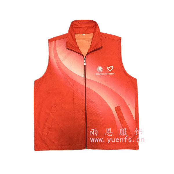 湖北随州电网服务队志愿者马夹是一款经过设计的马甲,前面白红相拼,渐变元素,加上下摆两个猪皮扣调节设计,前副及后副都丝印上电网的LOGO及标语