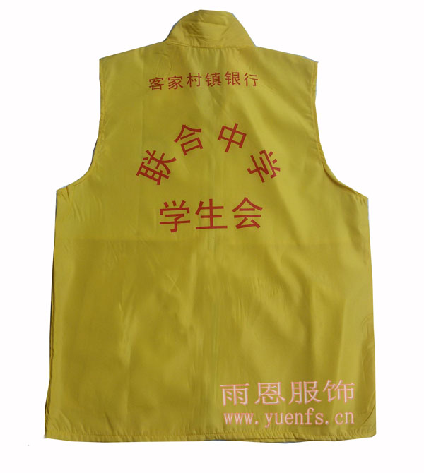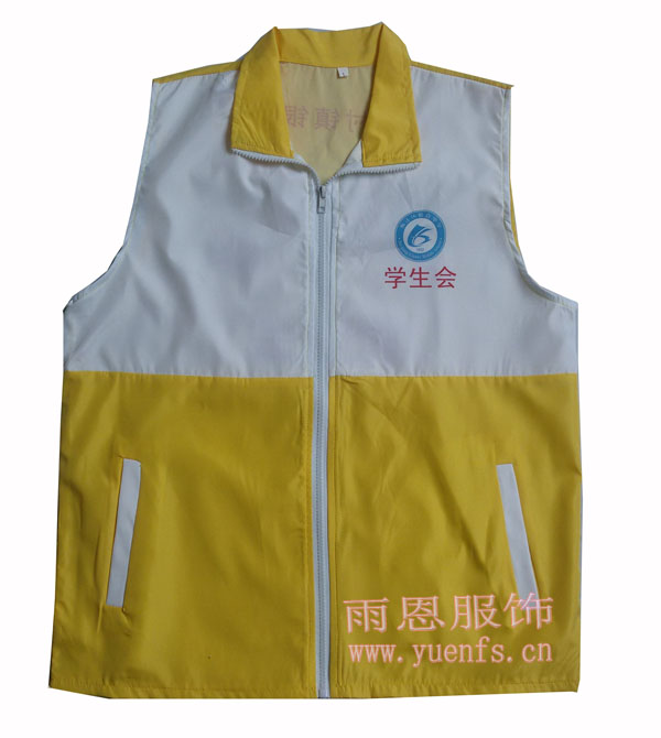 - 产品简介:学生会志愿者马甲所用的面料是复合水蜜桃,款式采用的是拼接设计,上面是白色,下摆是黄色,门襟拉链,两侧开了斜袋,方便装手机记事本。前副左胸及后副都丝印上LOGO和字。
