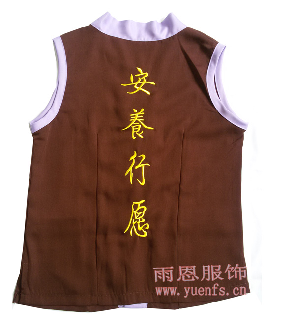 安养馆马甲是一款具有女性美的马甲,颜色选用的是咖啡色系配与紫色。在前胸同时也搭配上中国结的扣子。传统中又不失优雅的款式。在前副的左胸刺绣上字,及在后副的中间刺绣了字。
