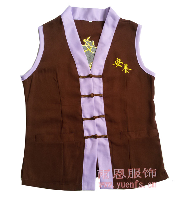 - 产品简介:安养馆马甲是一款具有女性美的马甲,颜色选用的是咖啡色系配与紫色。在前胸同时也搭配上中国结的扣子。传统中又不失优雅的款式。在前副的左胸刺绣上字,及在后副的中间刺绣了字。