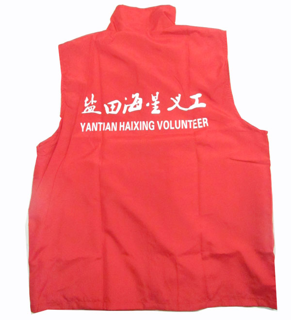 - 产品简介:产品简介:采用100%防水面料,双层设计,款式为时尚的立领 口袋加拉链 颜色多上百种选择。广泛应用为志愿者团体、义工团体、公益组织。学校、社区、企业、地铁、报社、慈善晚会、机场。正在使用该马甲的有:深圳海星义工、深圳中学、深圳社工协会、坪山新区义工队、华商律师事务所。